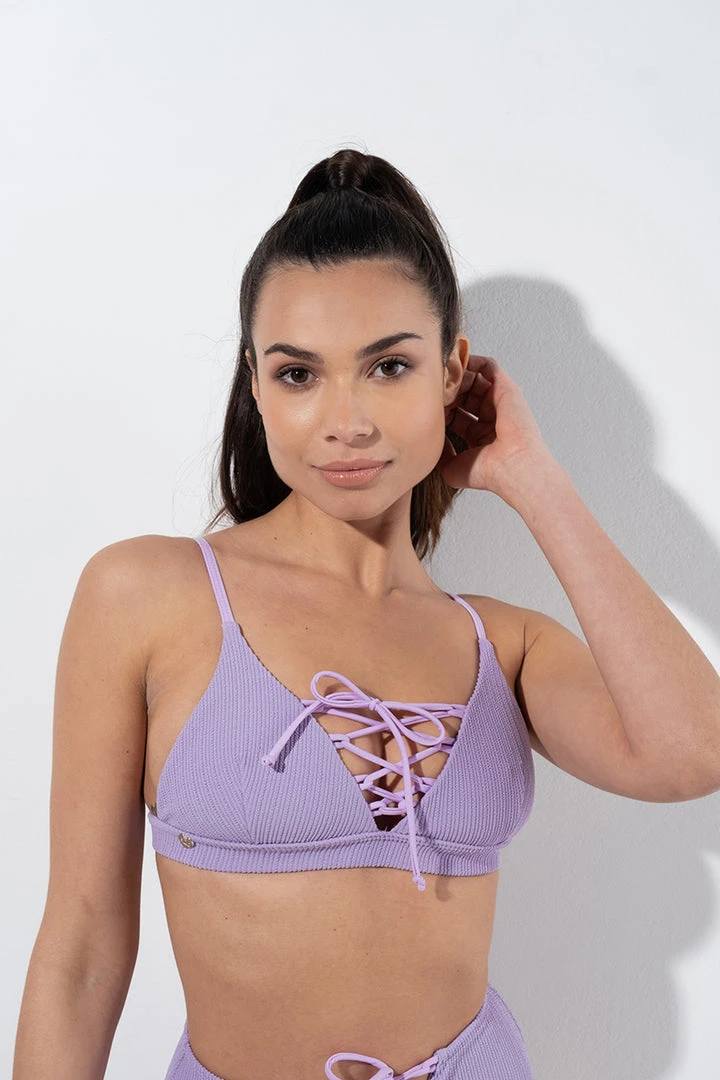 We are so excited to welcome our most beloved NIB top, in the dreamiest colour this season. It features a unique textured fabric, thick lace-up cleavage details and triangular cups that makes it a must-have. Wear it from your training to the beach.