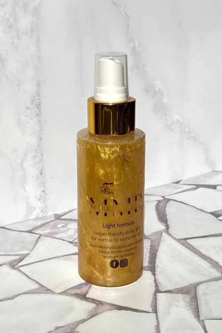 Application: Shake well before use. The glitter will settle and needs a little waking up. Spray onto the skin and apply a thin layer. More layers can be added for more intensity. Let dry for 30-60 seconds. Not advised for hand use.
