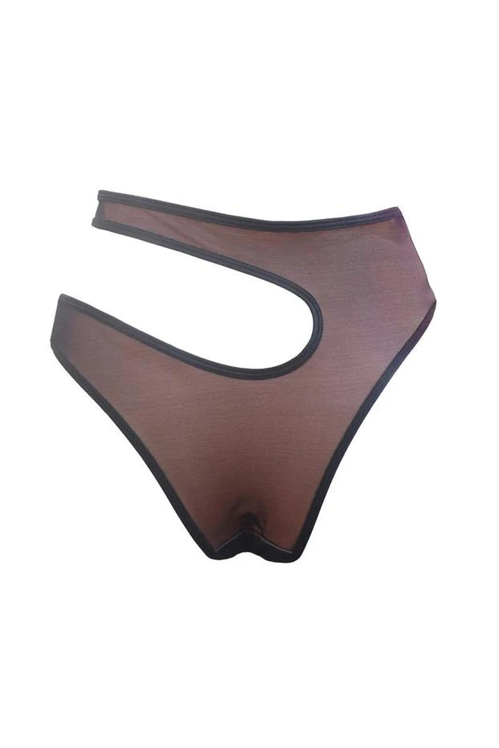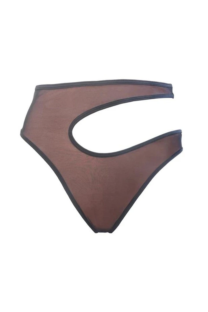 Get ready to turn heads in this iconic asymmetric black mesh set. High leg shorts with cut out section on one hip. The nude underlay gives the illusion of nudity without needing to bare all.