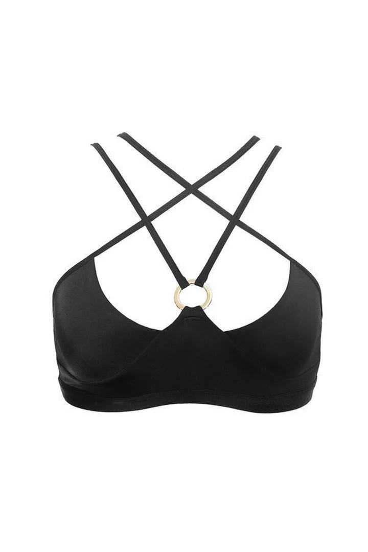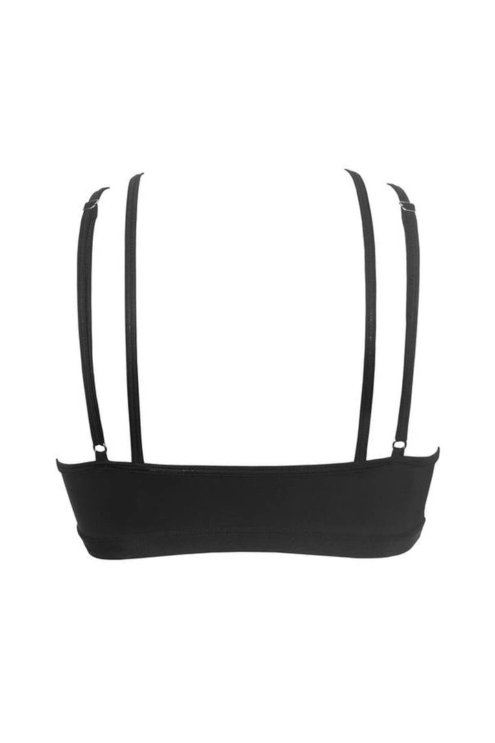 Classic black scoop neck top with strappy detailing.
