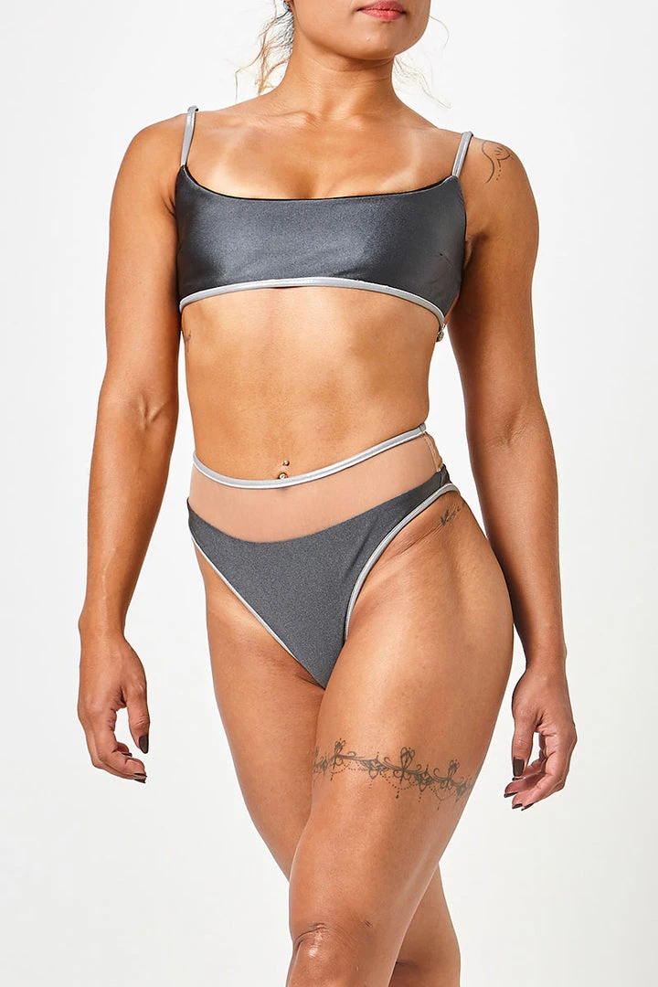 This shimmery set is out of this world. These reversible high leg bottoms can be worn black or Space Grey so you can change up our look. We love the cheeky cut and silver piping details.