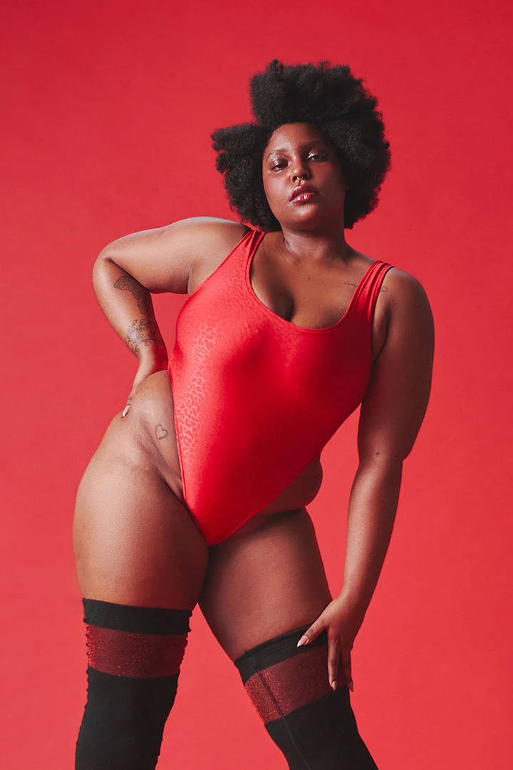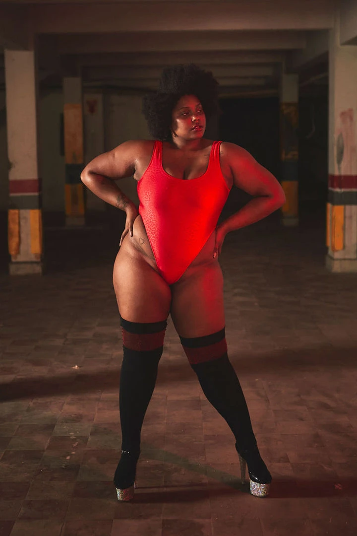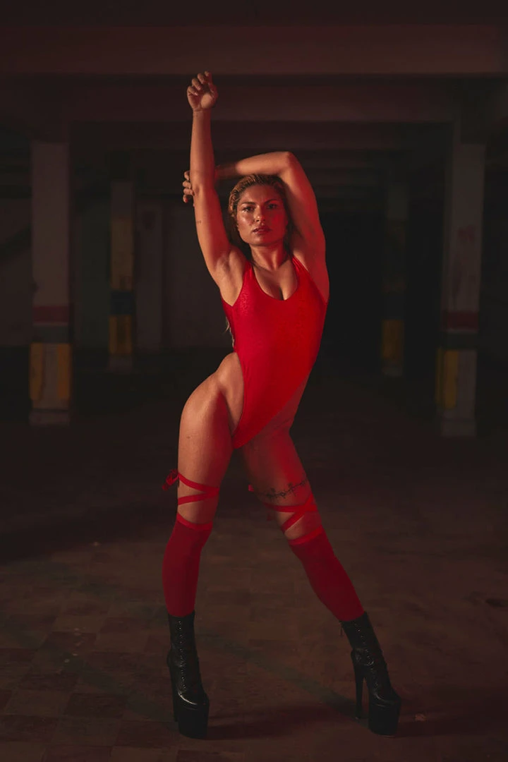 A high leg thong bodysuit that can be worn in and out of the studio. Styled here over he knee socks.